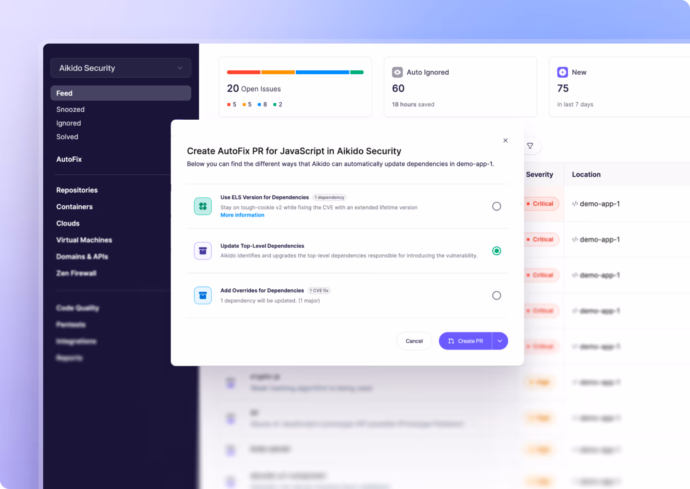 Aikido doesn't just nag you about vulnerable dependencies - it helps fix them. For many issues, it provides one-click AutoFix solutions: it suggests the safe version to upgrade to and can automatically open a pull request to bump the dependency for you. In other cases, it gives clear remediation guidance so you know exactly how to resolve the problem. Bottom line: it not only reports open-source security issues, it also streamlines the fix (often doing the heavy lifting for you).