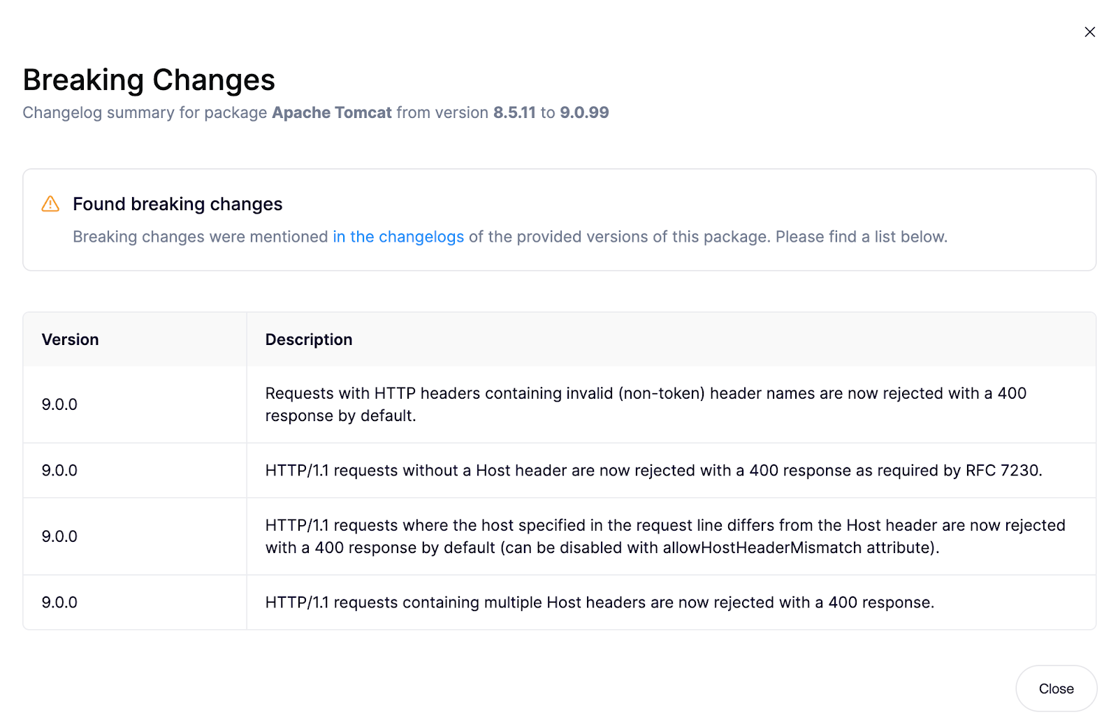 That provides the developer with transparency that there is no evidence either way on breaking changes. This could be down to the maintainer not documenting breaking changes or poor project maintenance. When no changelog is available, the upgrade is riskier, which signals to developers that they need to validate the upgrade manually.