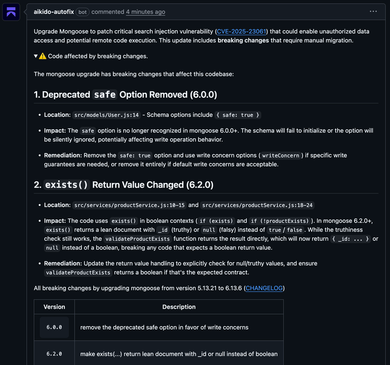In the example below, upgrading Mongoose introduces two breaking changes. The pull request identifies the exact files and lines that rely on deprecated behavior, explains what changed, and outlines what needs to be updated.