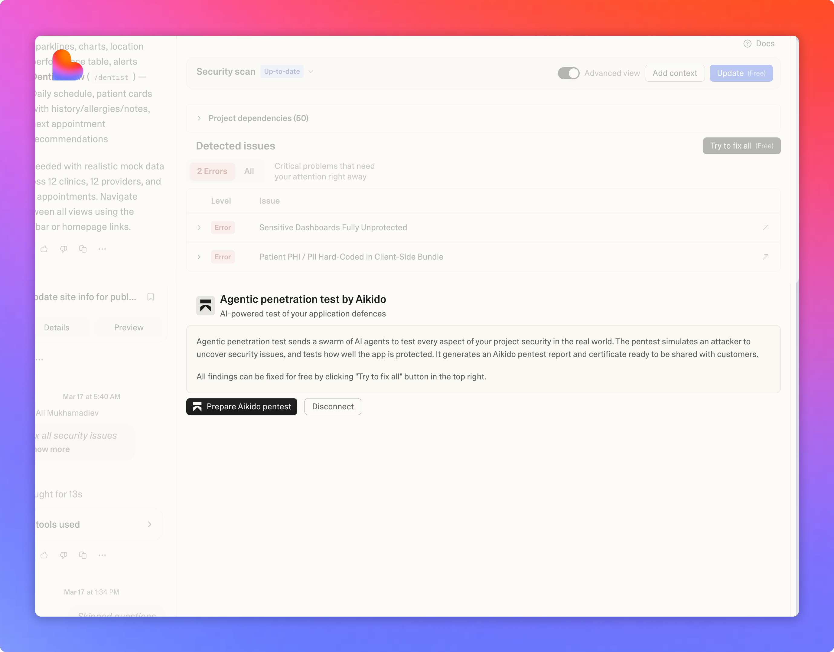 Lovable's Security Scanner is a strong foundation. It catches real issues and it's built into the workflow where it matters. What Aikido adds is the perspective of an external security firm, testing the actual running application the way an outsider would. That outside view is what most teams don’t have by default. The combination is powerful: internal checks plus external validation.