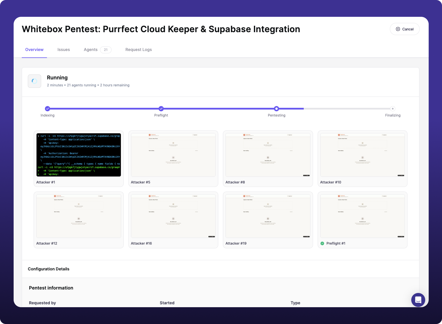 Advances in AI have changed what's possible here. The same depth of testing that used to require a team of senior security consultants over multiple weeks can now be delivered by autonomous agents in hours, at a price point that makes sense for applications at every stage of maturity. This is penetration-level depth, adapted for the vibe code era.