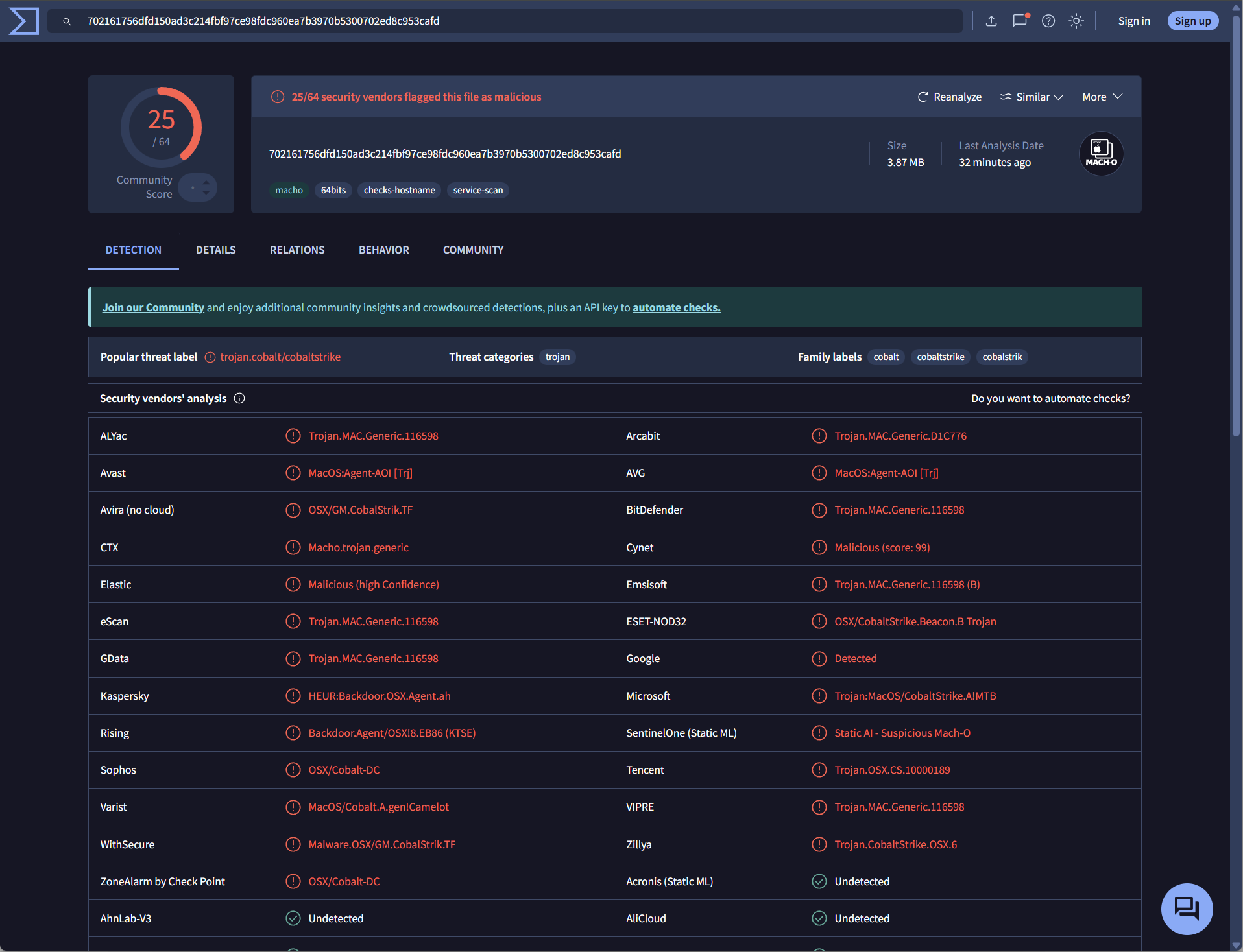 The Linux/macOS payload is consistently identified as a Cobalt Strike beacon across virtually all detecting vendors. Cobalt Strike is a commercial penetration testing tool that provides full command-and-control capabilities: remote access, credential harvesting, lateral movement, and payload deployment. While designed for legitimate red team use, leaked versions have made it a favorite of ransomware operators and APT groups. Its presence typically signals sophisticated adversaries with intentions beyond simple cryptomining.