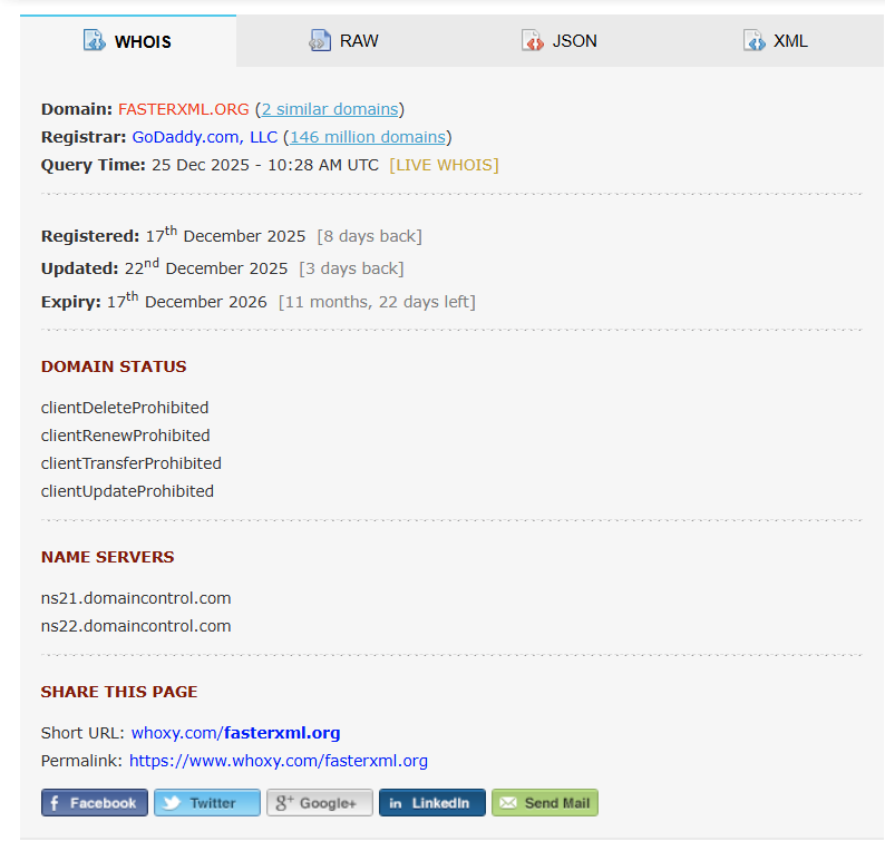 The typosquatted domain fasterxml.org was registered on December 17th, 2025, just 8 days before our analysis. WHOIS records show it was registered through GoDaddy and updated on December 22nd, suggesting active development of the malicious infrastructure in the days leading up to deployment.