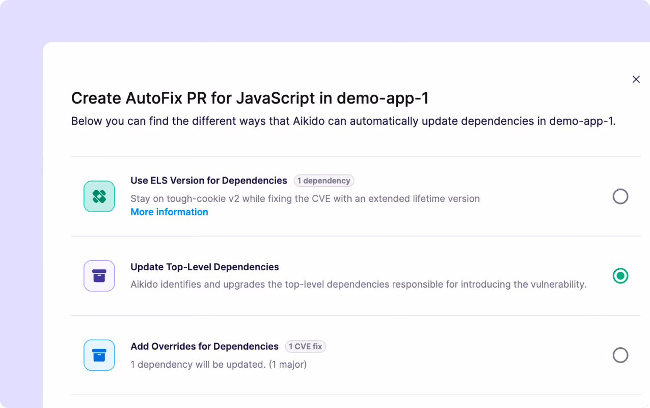 Aikido doesn't just nag you about vulnerable dependencies - it helps fix them. For many issues, it provides one-click AutoFix solutions: it suggests the safe version to upgrade to and can automatically open a pull request to bump the dependency for you. In other cases, it gives clear remediation guidance so you know exactly how to resolve the problem. Bottom line: it not only reports open-source security issues, it also streamlines the fix (often doing the heavy lifting for you).