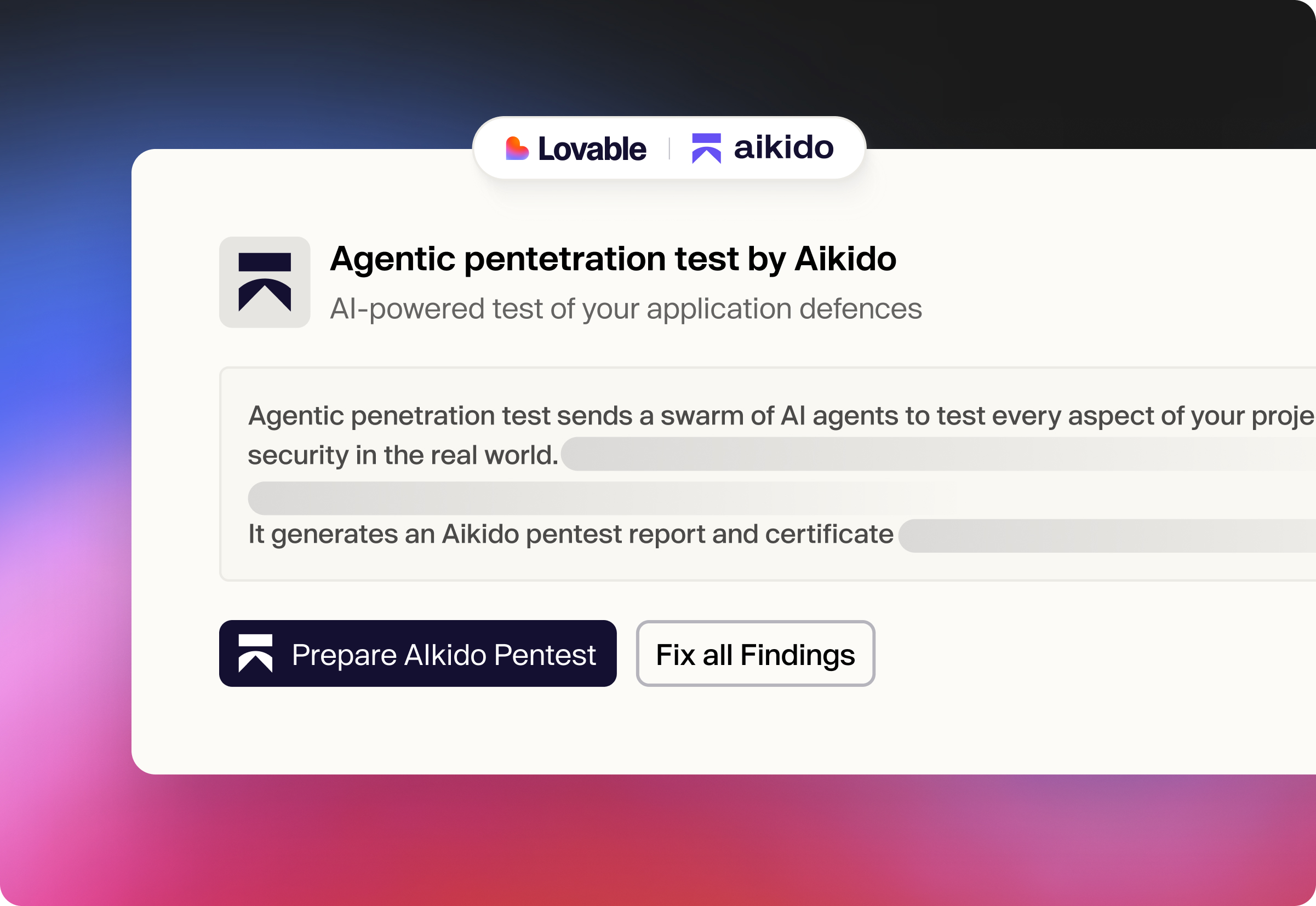 It's a real pentest, not a scan. Aikido deploys AI agents against your live, running application, the same one your users access. They probe login flows, try to access data they shouldn't be able to reach, and attempt to chain smaller weaknesses into bigger breaches. You get findings with full reproduction steps, not just a list of potential issues. Lovable's built-in scanner reviews your code before you publish. Aikido attacks what's actually running after you do.