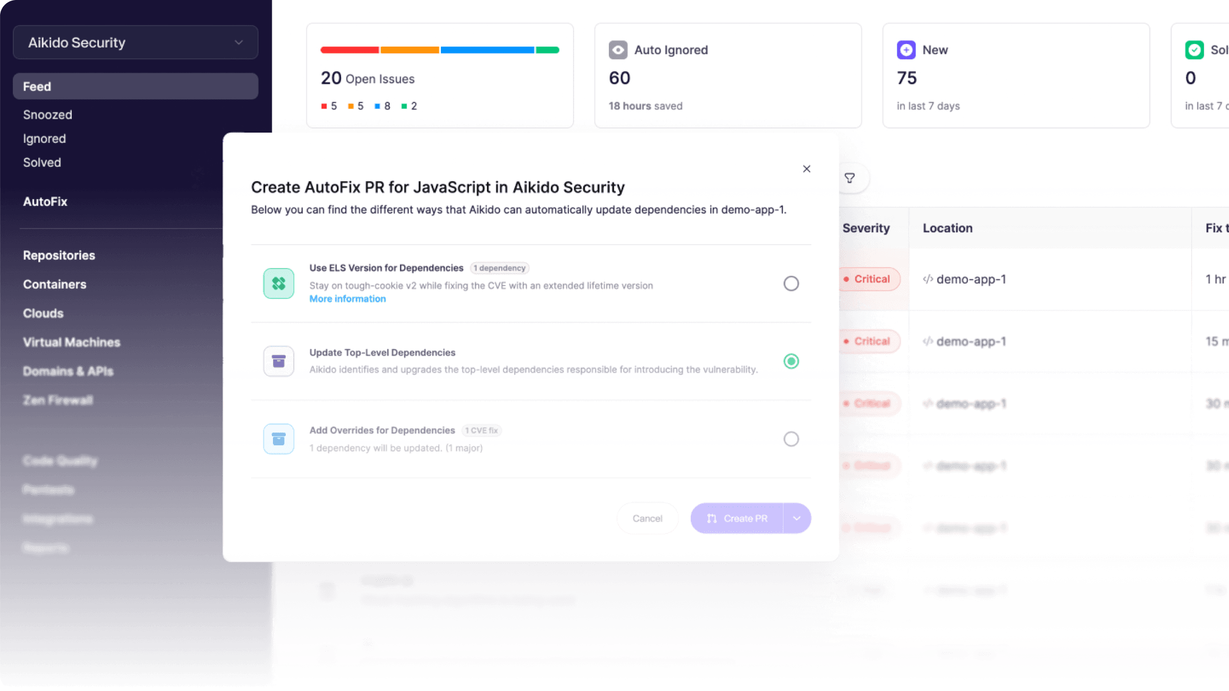 Aikido doesn't just nag you about vulnerable dependencies - it helps fix them. For many issues, it provides one-click AutoFix solutions: it suggests the safe version to upgrade to and can automatically open a pull request to bump the dependency for you. In other cases, it gives clear remediation guidance so you know exactly how to resolve the problem. Bottom line: it not only reports open-source security issues, it also streamlines the fix (often doing the heavy lifting for you).