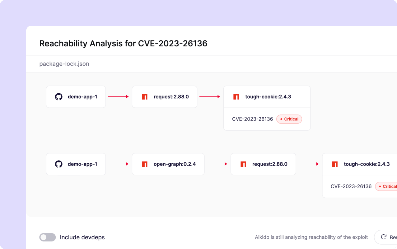 Aikido traces actual call chains from your code into third-party packages to determine which vulnerabilities are genuinely reachable at runtime and ignores the ones you’re not using.